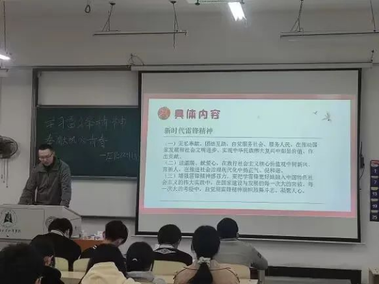 雷锋月活动期间,生物与化学工程学院组织各班团支部开展了以“学习雷锋精神,奉献火热青春”为主题的团日活动。各团支部成员通过一个又一个身边的好人好事,引导同学们树立正确的人生观和价值观,号召大家以实际行动践行雷锋精神。