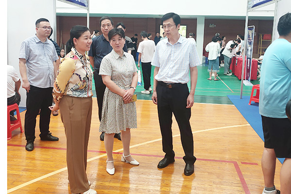 6月19日,2023年“才聚荆楚·百县进百校”就业促进专项行动暨湖北大学知行学院2023届毕业生专场招聘会在学校体育馆举行。新洲区委组织部、新洲区人力资源和社会保障局组织相关企业进校开展招聘活动。学校院长高连顺等校领导前往招聘现场深入了解企业用人需求和毕业生应聘情况。