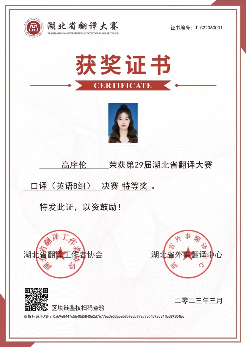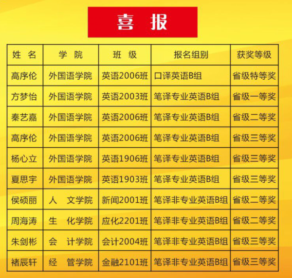 近日,第二十九届湖北省翻译大赛决赛成绩出炉,知行学子在此次比赛中喜获佳绩,荣获省级特等奖1项、一等奖1项、二等奖3项,三等奖5项。其中,英语翻译2006班高序伦同学荣获专业英语B组口译特等奖,名列该组别全省第一,这是我校自2017年后再次夺得口译组全省第一的佳绩。外国语学院林名仲老师和王丹老师荣获大赛“优秀指导老师”荣誉称号。