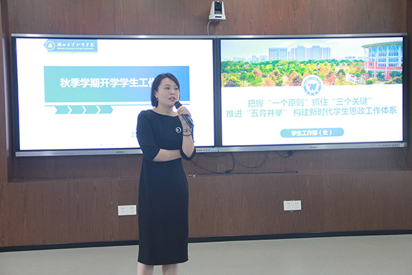 为确保秋季学期各项学生工作有序开展,8月31日,学工处在知真楼四楼418智慧教室组织召开学生工作会议。党委副书记黄智凌出席会议,各二级学院党总支书记、副书记、辅导员及全体学工处工作人员参加会议。