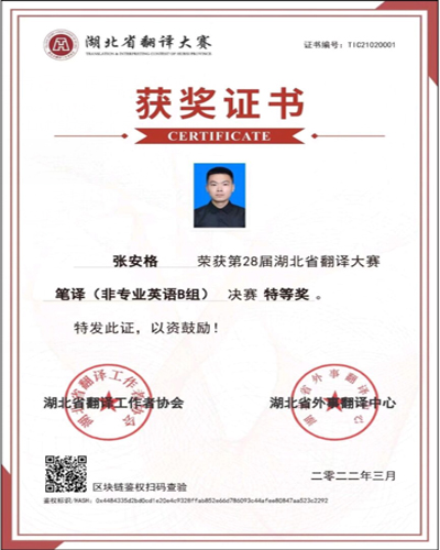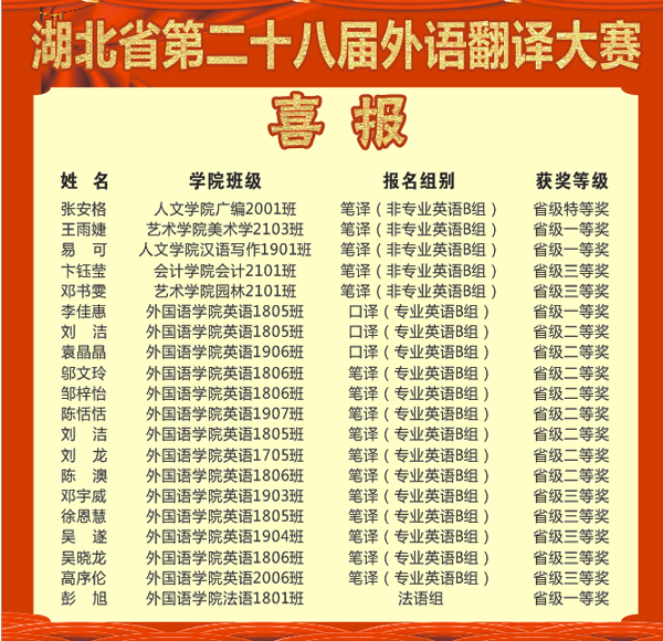 近日,第二十八届湖北省翻译大赛决赛成绩揭晓,知行学子共获得20项奖项,其中,人文学院广编2001班张安格同学获非专业英语B组(笔译)省级特等奖,创造了学校参赛以来该组别历史最好成绩。