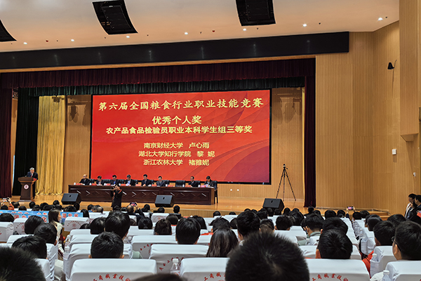 11月13日至15日,第六届全国粮食行业职业技能竞赛决赛在广西南宁举行,本届竞赛由国家粮食和物资储备局、中国就业培训技术指导中心、中国财贸轻纺烟草工会联合主办。我校粮食与食品工程学院安检2102班黎妮、陈雪瑶,食科2001李怡惠三名同学作为湖北省粮食局代表队成员参加比赛,其中黎妮同学荣获农产品食品检验员本科学生组三等奖,湖北省粮食局代表队获得团体三等奖和优秀组织奖,学校粮食与食品工程学院2019届毕业生余卓帆获得(粮油)仓储管理员职业职工组二等奖。