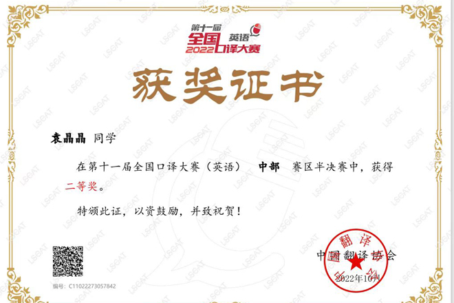 全国口译大赛是展现全国大学生口译综合能力的顶级权威赛事。本次大赛吸引了来自全国近600所高校的学生,其中不乏众多高校研究生参加。受疫情影响,本届大赛采用线上比赛方式,历时近五个月。大赛内容分为英译汉和汉译英两部分,综合考查选手的口译水平,话题涵盖“新冠疫苗”“人口政策”“元宇宙”到“俄乌冲突”等,不仅考察选手对热点话题的关注以及相关背景表达的掌握,同时要求选手具备稳定的心理素质和过硬专业素质。袁晶晶同学在6月份的湖北省复赛中脱颖而出,成功晋级半决赛,并在10月份的中部赛区半决赛中获得二等奖。