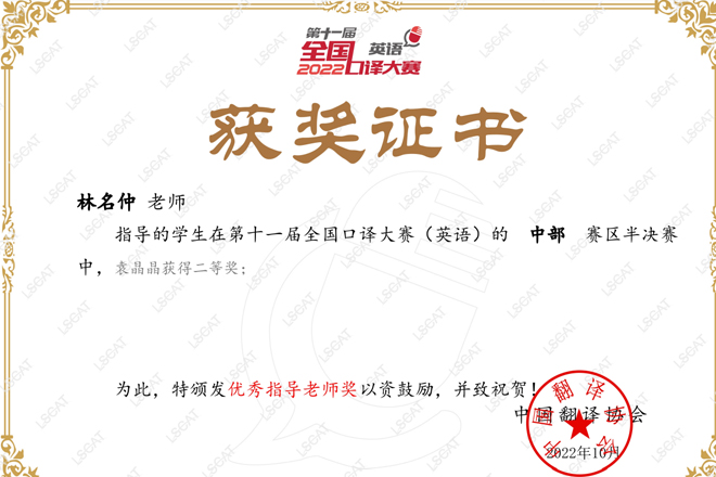 近日,由中国外文局、中国翻译协会主办的第十一届全国口译大赛半决赛落下帷幕,外国语学院英语翻译1906班袁晶晶同学荣获中部赛区半决赛二等奖,这是继2017年我校入围全国口译大赛半决赛以来获得的最好成绩。英语专业李佳惠、牛媛尉、高序伦三名同学获得省级优秀奖,外国语学院林名仲老师荣获“优秀指导老师”称号。