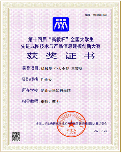 近日,第十四届“高教杯”全国大学生先进成图技术与产品信息建模创新大赛在西南交通大学圆满举行。我校机械与自动化学院9名学生组队参加该项赛事并喜获佳绩,共荣获全国机械类制图基础知识二等奖1项、机械类团体三等奖1项、孔维安、魏政两名同学均获得个人全能三等奖。