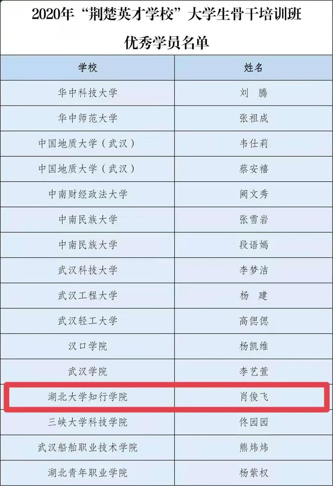近日,团省委、省学联举办的2020年度“荆楚英才学校”湖北省大学生骨干培训班评选出16名优秀学员,我校人文学院肖俊飞同学从百余人中脱颖而出荣获“优秀学员”荣誉称号。