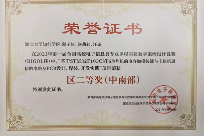 近日,第一届全国高校电子信息类专业课程实验教学案例设计竞赛(“RIGOL”杯)复赛在西安电子科技大学落下帷幕。我校计算机与信息工程学院阳子轩、汤莉莉、汪璇教师团队参赛的《基于STM32F103C8T6单片机的电容触摸按键与上位机通信的电路及PCB设计、焊接、开发实践》项目荣获中南区二等奖。