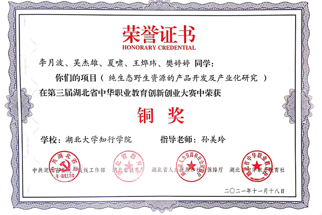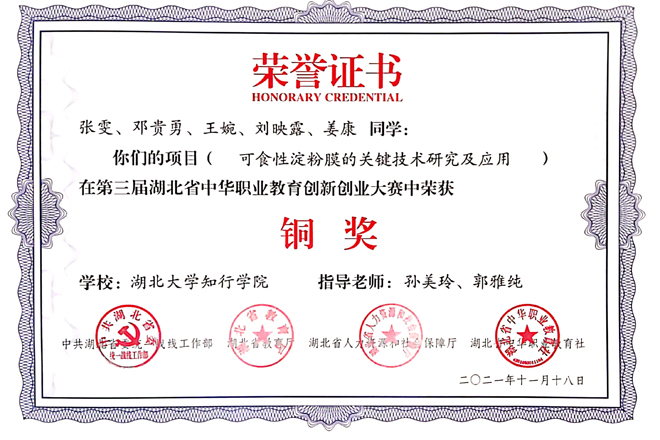 11月29日,第三届湖北省中华职业教育创新创业大赛颁奖典礼在宜昌举行,我校粮食与食品工程学院孙美玲、郭雅纯两位老师指导的学生团队项目《纯生态野生资源的产品开发及产业化研究》获应用本科组铜奖,《可食性淀粉膜的关键技术研究及应用》获高职高专组铜奖。
