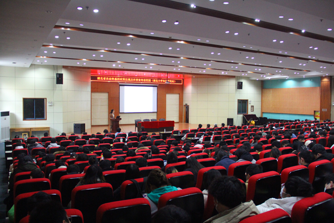 为宣传普及农业转基因科普知识,12月22日下午,“农业转基因政策法规及科普宣传进校园”活动在知远楼弘德厅举行。此次活动由湖北省农业农村厅主办,湖北大学知行学院承办。湖北省农业厅科教处二级调研员、省农业转基因生物安全管理办公室副主任柯枫英,湖北省农业农村厅农业科技人才办公室副主任金国胜、科长侯应霞等出席活动,学校粮食与食品工程学院院长刘齐主持讲座,400余名师生代表参加活动。