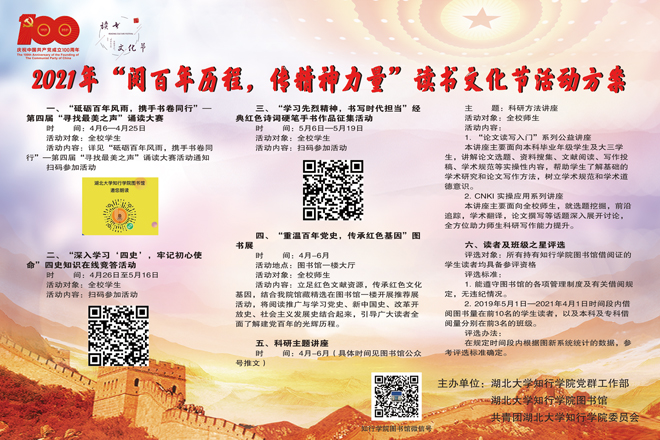 为庆祝中国共产党建党成立100周年,深入推进校园文化建设,激发广大师生阅读兴趣。4月23日世界读书日当天,学校第六届“阅百年历程 传精神力量”读书文化节系列活动启动。
