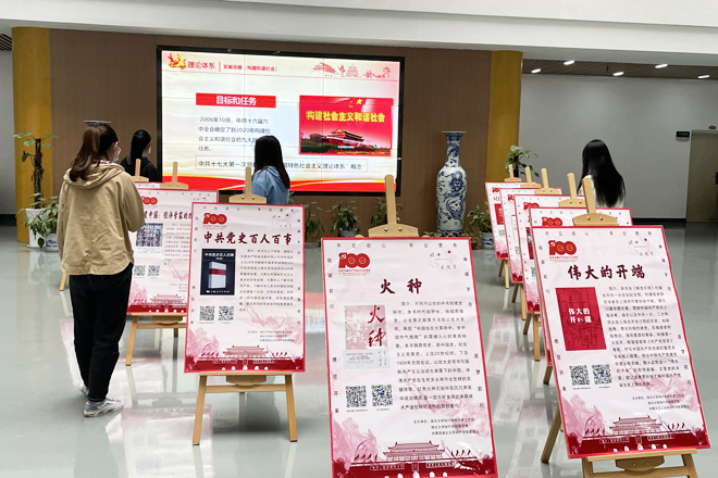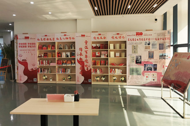活动当天,主题为“重温百年党史 传承红色基因”红色书展在图书馆同步拉开帷幕,邀约全校师生品读红色经典书籍,追忆建党百年光辉历程。此次书展从红色经典文学、红色人物传记、党史文献、党史理论四个方面精心挑选了100余本纸质馆藏书籍进行线下展示,《红旗谱》、《红色的起点》、《毛泽东传》、《周恩来传》、《中国共产党建设史》、《中国共产党历史大事记》、《共产党宣言》、《习近平谈治国理政》等一系列书籍将带领读者重新走入建党历史,钩沉红色记忆,传承革命精神,不忘初心使命。书展还以线上的方式提供了《火种:寻找中国复兴之路》、《这里是中国》、《井冈山斗争口述史》等十本最新电子图书供读者扫码下载阅读,并增设了阅党史•书真情的互动环节,让参与者在书签上写下阅读感受和建党100周年祝福语,营造党史学习教育浓厚氛围。