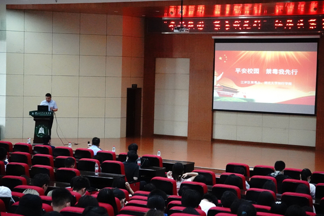 为深化平安校园建设,5月28下午,由江岸区禁毒办、江岸区公安分局禁毒大队、谌家矶街道办事处联合举办的“平安校园,禁毒我先行”禁毒宣传活动在学院知远楼弘德厅举行。江岸区禁毒委员会办公室副主任李树雪、江岸区公安分局禁毒大队长罗中华、谌家矶街道办事处副主任蔡志祥、学校副校长黄智凌出席活动。禁毒志愿者及师生代表参加活动。