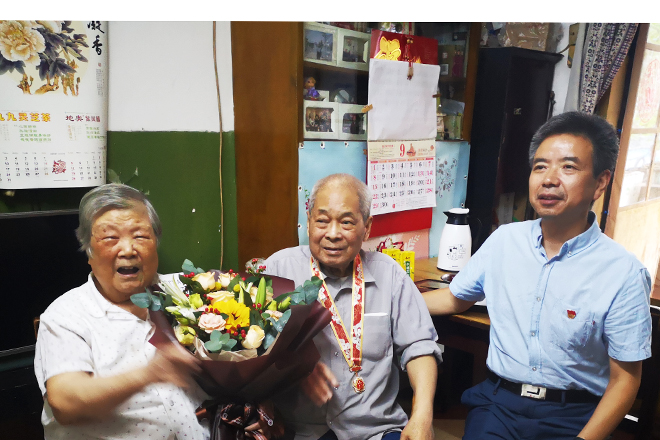 9月27日,在国庆和重阳节前夕,校党委书记彭德忠走访慰问了我校离退休老党员、共和国勋章获得者郑火老同志,为郑老佩戴上由中共中央、国务院、中央军委颁发的“庆祝中华人民共和国成立70周年纪念章”,详细询问了解郑老的日常生活和身体状况,并向郑老送上鲜花和节日的问候,祝福郑老健康长寿、生活幸福!