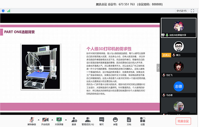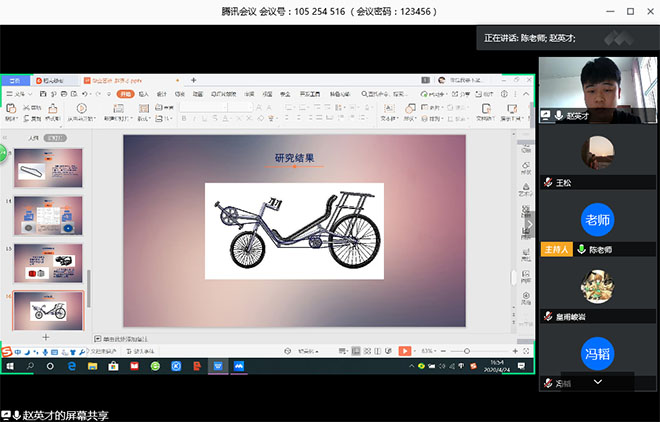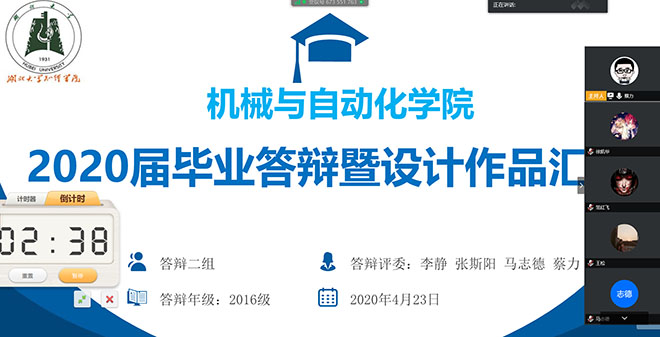 “终于通过网络看到了我亲爱的老师和同学们,这个特殊的经历将让我终生难忘!感谢学校、学院和我的指导教师的辛勤付出。”机械设计制造及其自动化专业2020届毕业生颜睿通过腾讯会议平台进行了线上答辩,成为机械与自动化学院首个通过线上完成毕业设计答辩的学生。4月23日—24日,机械与自动化学院严格按照《湖北大学知行学院本科毕业论文(设计)工作管理办法》的工作要求,通过腾讯网络会议平台举行2020届毕业论文线上答辩。学校副校长钟春敏和教务处负责人、督导员进入线上答辩现场观摩指导。