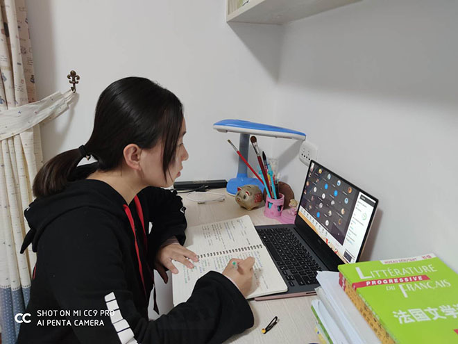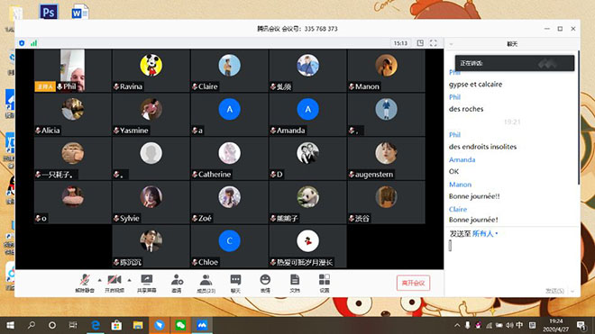 “他对每一位学生都充满耐心,虽然身在法国,但时刻牵挂同学们的安全。”谈及Philippe老师, 法语1701班刘明菲同学如是说。在学校准备开展线上教学后,身在法国巴黎的Philippe老师提出直播授课的想法,不会中文软件的他,耐心的学习了多个网络教学平台的特点,并努力克服时差,开始了在腾讯课堂的教学。教学中,Philippe老师除了课前发送相关新闻报道的有趣视频图片,要求学生提前预习外,还会在一周的最后一堂课布置一个主题或者一个故事,让同学们写作并录音,自己再逐一聆听对学生进行点评指导。