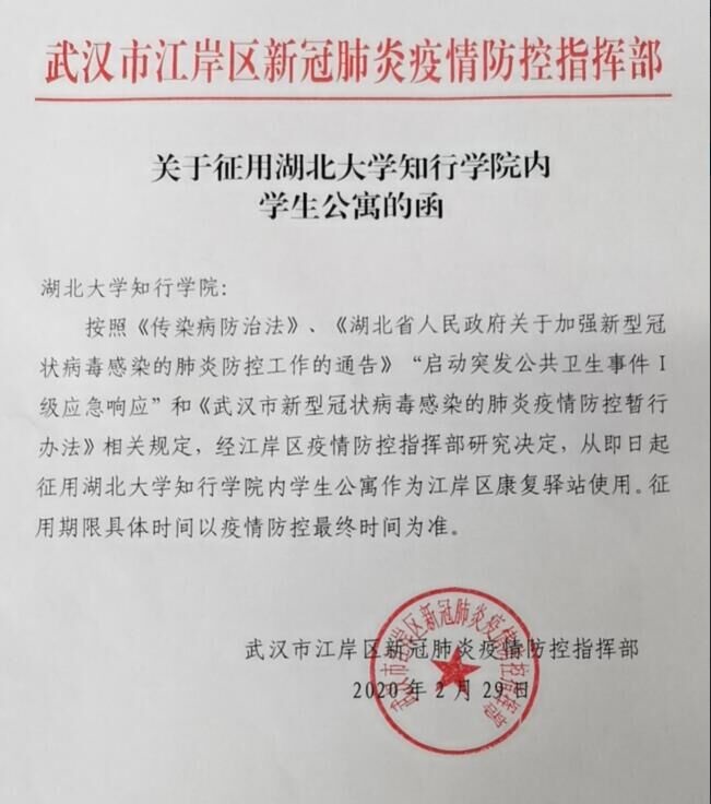 疫情防控,人人有责,抗击疫情没有旁观者。2月29日,江岸区新冠肺炎疫情防控指挥部在已经征用学校5栋公寓的基础上,再次下达征用剩余的8栋学生宿舍作为康复驿站的通知。