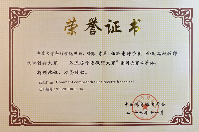 本届大赛是由中国高等教育学会主办,高等教育出版社承办,教育部高等学校大学外语教学指导委员会协办的一项全国性外语教学竞赛活动。大赛旨在提高教育质量,实现高等教育内涵式发展,探索有效的外语数字资源建设和共享机制,搭建外语教师教学经验交流和教学风采展示平台。比赛启动以来,外国语学院精心组织各教研室积极参赛,经过参赛教师的集体努力,不断打磨,外国语学院陈颖、李星、孙偲、伍澄老师组成的法语专业教师团队最终荣获全国“日俄德法等语组”决赛二等奖,祝娟、王丹、伍澄、冯健四位老师组成的英语专业团队获湖北赛区二等奖,贺欢、向蕊、刘磊、黎媛四位老师组成的大学英语团队获湖北赛区二等奖;伍澄、孙偲两位老师组成的英语专业教师团队获湖北赛区三等奖。