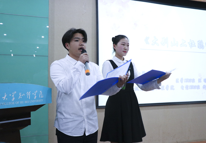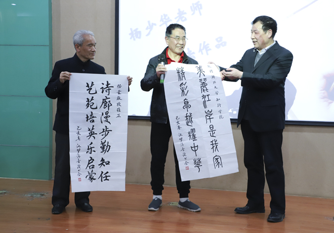活动开始前,人文学院负责人任秀霞致欢迎辞,她感谢各位文学大家和朗诵大师对知行学院的关注,希望借助视听的享受引发广大同学从此爱上文学、更爱文学。随后,伴随着优雅的轻音乐背景,朗诵会拉开帷幕。湖北省朗诵协会、武汉汉梦清音读书会、江城朗读者会等单位嘉宾与我校毕业校友和在校学生先后诵读了任蒙老师的精选作品片段,包括《雨中,淡淡的小城——告别》《雨中,淡淡的小城——宁静》《千山夕照的旅程》《梦中泛舟》《父亲的手》《云中三日》《泸定桥遐思》《西行小记》《峡江赋》等。朗诵者们抑扬顿挫、情感丰富的诵读演绎为大家奉献了风格各异的文学享受,赢得现场观众一阵阵热烈掌声。特邀嘉宾谢东升老师、吴海燕老师还分别以作品《君子之水——给任蒙》《二十九个荷包蛋》进行了高水平的现场示范朗诵,将朗诵会活动推向高潮。活动中,特邀嘉宾杨少华老师还向人文学院赠送了书法作品。