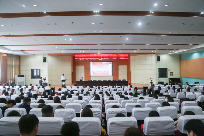 4月24日下午,应学校邀请,湖北省委宣讲团成员、省委党校教授王辉莅临我校,为全校师生党员作“坚持全面依法治国”专题辅导报告。校党委书记彭德忠主持报告会。在校校领导和全校师生党员现场聆听报告。