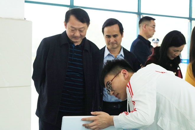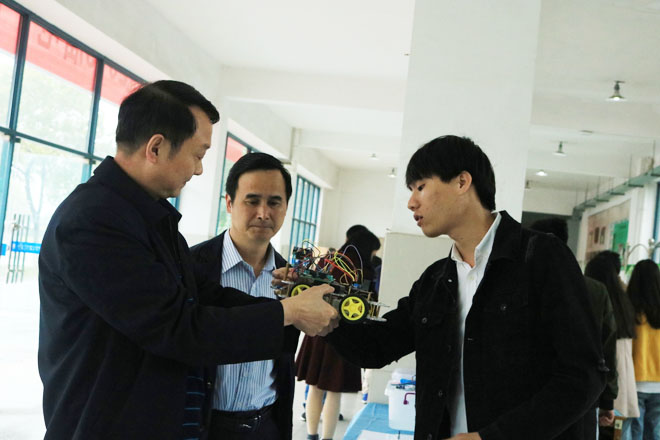 近日,我校计算机与信息工程学院2019届电子信息类专业毕业设计作品展在知化楼一楼展厅举行,50余名毕业生利用专业所学创新设计制作的作品亮相,引来众多师生纷纷前来参观。校长卜诗桢、副校长钟春敏、陈刚等校领导及相关职能部门负责人现场参观了学生的毕业作品成果展,对同学们的专业及创新能力给予了高度赞赏。