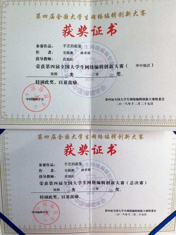 近日,第四届全国大学生网络编辑创新大赛颁奖大会暨2019网络编辑教育创新论坛在南京隆举行。由我校人文学院范旭阳老师指导,广播电视编导专业1501本班安振彬、林卓林两位同学共同创作的作品《手艺的温度》荣获大赛总决赛视频类三等奖。
