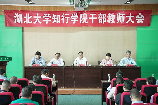 5月8日下午,学院在知远楼202弘智厅召开干部教师大会,宣布湖北大学党委关于换届后的知行学院领导班子成员的决定。湖北大学党委常委章天金教授出席会议并讲话。湖北大学党委组织部常务副部长何凤桃主持会议。湖北大学学科建设与发展规划处副处长袁建军,知行学院领导班子全体成员、全体中层干部和教师代表参加会议。