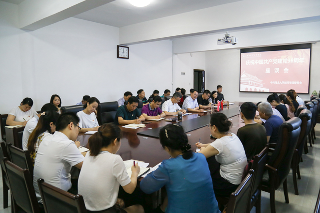 为纪念中国共产党成立98周年,同时表彰先进、树立典型。6月28日上午,学校党委在知言楼三楼会议室隆重召开座谈会。校党委书记彭德忠在讲话中动员全校各基层党组织和全体共产党员,深入学习贯彻习近平新时代中国特色社会主义思想和党的十九大精神,继续保持创先争优、敢为人先的精气神,继续发扬艰苦奋斗、求真务实、担当奉献的模范作用,砥砺奋进、干在实处、做出新作为,不断开创知行学院事业发展的新局面。校长卜诗桢主持座谈会。全体校领导,各党总支、直属党支部书记,教师党员、离退休党员、学生党员代表及相关职能部门负责人参加座谈会。