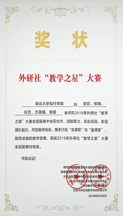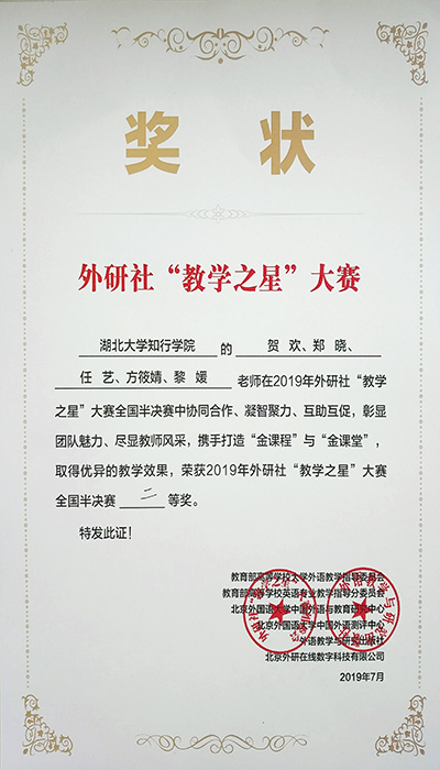 8月3日,2019年外研社“教学之星”大赛大学英语组全国半决赛在苏州圆满落幕,我校外国语学院教师贺欢、郑晓、任艺、方筱婧、黎媛组成的教学团队在此次大赛中充分展现了知行教师的风采,喜获该项赛事全国半决赛二等奖。