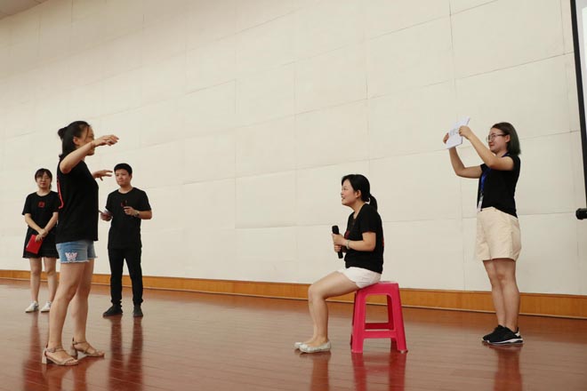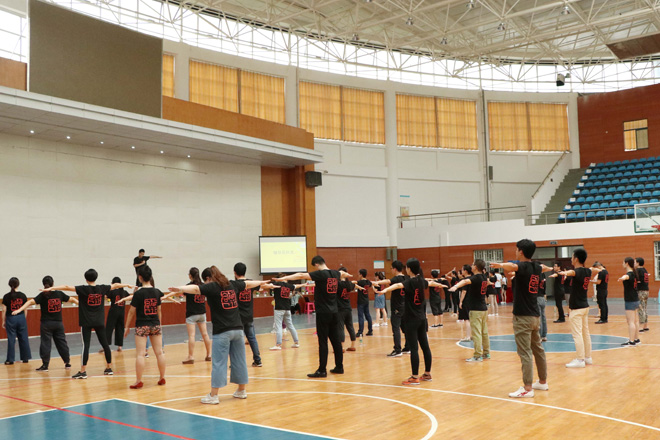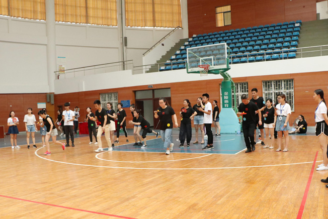 下午3:00,在两位辅导员刘星和张忠萌充满活力与激情的开场白下,辅导员沙龙正式拉开序幕。活动伊始,参赛队员们分成七组开展第九套工间操学习,在会计系辅导员殷茂胜老师的带领下,各小组认真学习每一个动作,了解每一段节拍,很快便将连贯动作一气呵成,大家不禁为自己的努力鼓掌。工间操的学习不仅展示了各位辅导员努力增强体魄的精神,更体现出我院辅导员队伍乐于学习、积极进取、阳光开朗的良好精神面貌。接下来,进入游戏环节。在主持人的引导下,各位辅导员重新抽签组成A B C D四个小队,齐心协力地完成考验辅导员老师们表达领悟能力的“你来比我来猜”,考验平衡性的“乒乓球接力赛”和体现团队配合及默契的“心心相印”,现场气氛活跃,其乐融融。