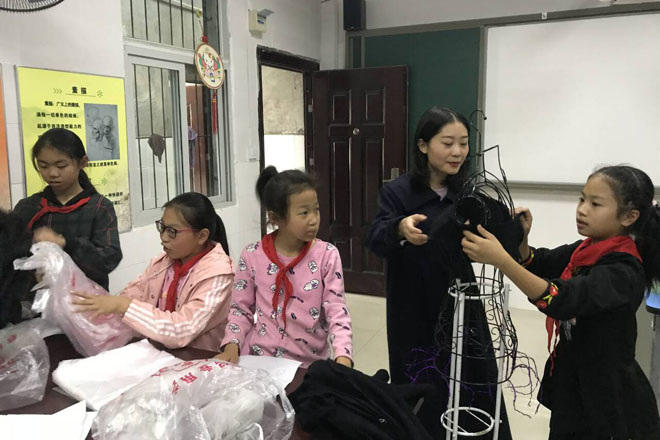据悉,“放飞梦想 沐风行动-大手拉小手”志愿服务系列活动持续有10年,已成为谌家矶小学在江岸区的品牌活动。在活动中,我院艺术系、计算机系、人文系的学生志愿者充分结合专业特点,牵手谌家矶小学的学生们成立种类多样的社团,既有结合“中华民族传统文化”“经典诵读”等内容的知识性诗词社团;也有魔方、空模、航模、机器人、乒乓球、书法、空竹、踩高跷、打陀螺、功夫扇等现代、传统技能性社团,学生参与面达100%,让谌家矶小学的孩子们在课堂学习之余有更多不一样的感受。