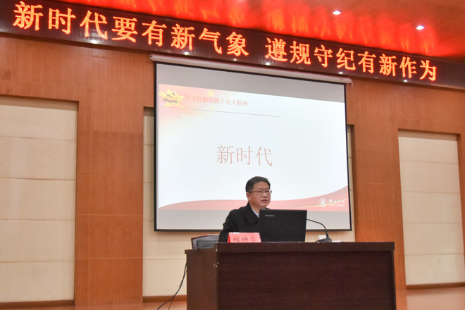 报告中,檀书记以“新时代要有新气象、遵规守纪有新作为”为主题,紧扣十九大提出的新时代、新矛盾、新思想、新征程,为广大党员干部师生全面深入地宣讲了党的十九大精神和习近平新时代中国特色社会主义思想。他强调,习近平总书记在党的十九大上作的报告内涵丰富、思想深邃、高屋建瓴,启迪思想、鼓舞人心、催人奋进,通篇闪耀着马克思主义真理的光芒,具有很强的思想性、战略性、前瞻性、指导性,具有重大的政治意义、理论意义和实践意义,我们要深刻学习领会,并在实际工作中予以贯彻落实。