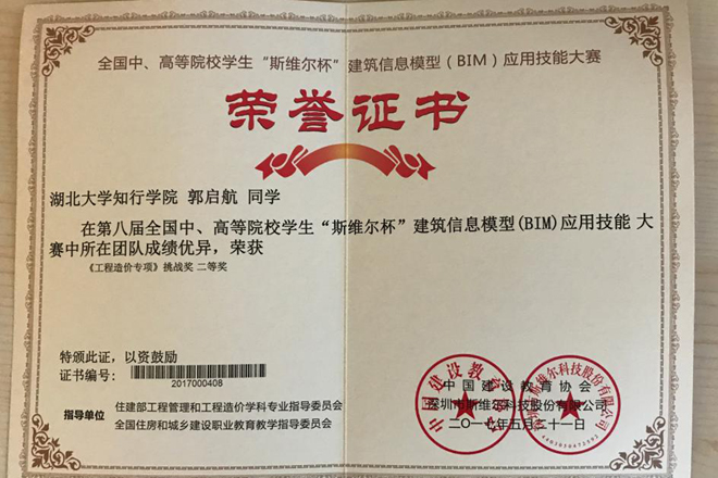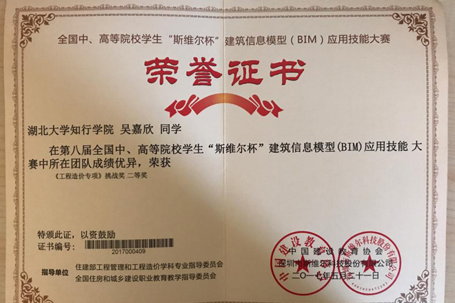 初赛中,来自全国31个省市自治区的506所高校,10000多名参赛人员参与角逐。经过层层选拨,最终有453所大学的457支代表队的3200余人晋级总决赛,登上了2017年度“斯维尔杯”建筑信息模型(BIM)总决赛的舞台,我院经管系学生代表队凭借优异的表现顺利闯入决赛。决赛中,参赛选手全部通过“斯维尔自动化大赛考试系统(THS-ACS)”进行答题,每支队伍使用两台电脑进行网上作答。我院参赛代表队采用分工合作的方式进行作答,合理安排了人员分配,一号电脑由郭启航、吴嘉欣两位同学采用从前往后的方式操作作答,二号电脑由陈一帆、姚明明两位同学采用从后往前的方式操作作答。经过激烈的竞争,知行学子最终凭借扎实的专业功底从450余支决赛队伍中脱颖而出,获得了“工程造价专项”挑战奖二等奖的好成绩。
