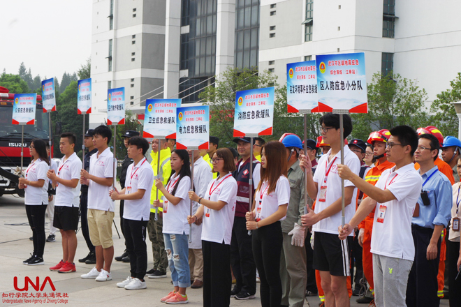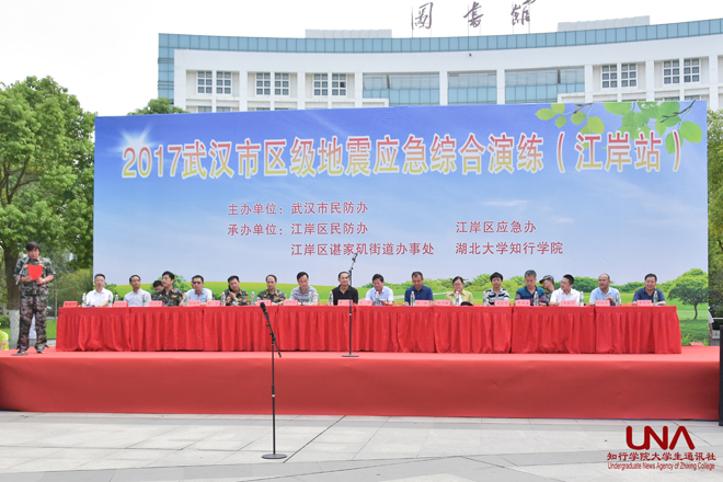 上午9时,江岸区区委常委、区政府常务副区长、区防震减灾指挥部指挥长余松宣布演练开始。根据演练场景预设,灾情发生后,当地各级政府迅速按要求上报情况,同时启动应对自然灾害预案。随后,灾情报送、核查、会商、应急救助等各阶段抗震救灾工作在迅速有序展开。演练中,江岸区民防办组织了公安、消防、卫生防疫、供电、水务等多部门联动,进行了人员紧急疏散、人员搜救、震后灭火、震区消毒等综合演练,还重点进行了学生自救互救等科目的演练。演练过程中,各参演单位目标一致、服从指挥、紧密配合,使抗震救灾救援队伍快速反应演习达到了预期的目的,地震应急运作机制也在实战中得到检验。演练结束后,江岸区民防办主任孙汉平宣读了成立“武汉市防震减灾志愿者湖北大学知行学院中队”的决定,并进行了授旗仪式,中队长陈兵带领学生志愿队进行了宣誓。江岸区民防办和蔡甸区民防办进行了演练旗帜交接。