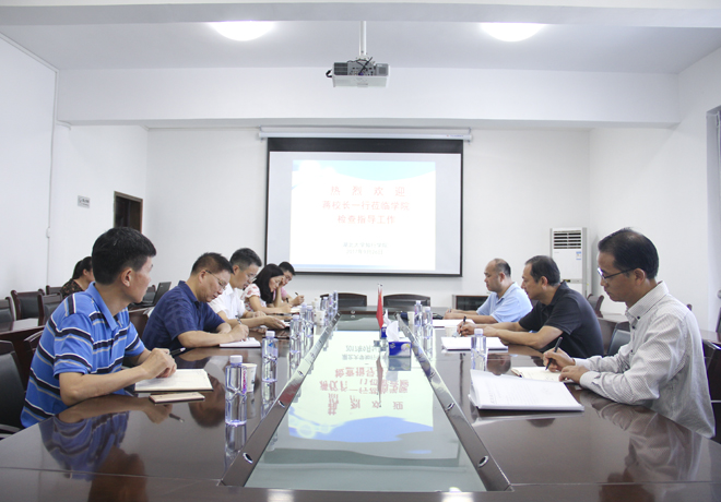 蒋涛副校长一边听取工作汇报,一边就汇报中的相关具体工作与大家进行了讨论交流。他充分肯定了学院新学期开学的各项准备工作,并针对相关具体工作提出了意见和建议。蒋涛副校长指出,学院今年本科录取分数线及在同类高校的位次进一步提升,文科位列全省32所同类高校第7,理科位列第9,这充分表明了学院近年来的社会声誉和办学水平在不断提升,得到了社会和广大考生家长的认可。学院领导班子要再接再厉,分析原因,进一步明确与排名靠前的同类院校的差距和不足,乘势而上,推进学院办学水平再上新台阶。蒋涛副校长还嘱咐学院领导班子要把新学期开学各项工作落实落细,认真谋划好新学期其它各项工作,确保校园的和谐稳定,以优异的成绩迎接党的十九大胜利召开。