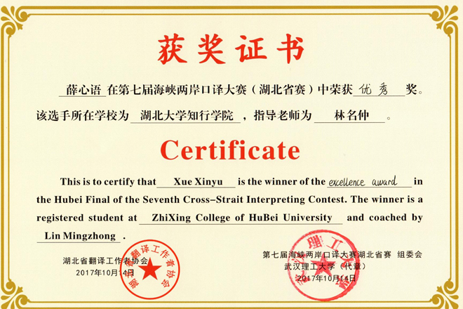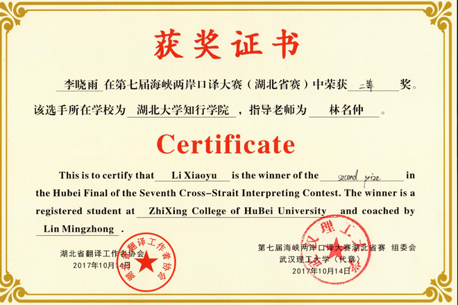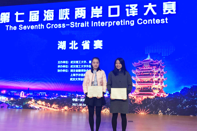 近日,第七届“海峡两岸口译大赛”湖北省赛在武汉理工大学举行。我院外国语系英语专业1404班李晓雨同学表现优异,与来自全省40余所高校的80多名本科生、研究生和自由译者同台竞技,经过三轮比拼,李晓雨同学喜获湖北赛区二等奖,创造了我院参加该项赛事以来的最好成绩,同时也是本届赛事同类院校的最好名次。
