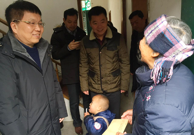 1月18日上午,在2017年新春佳节即将来临之际,学院党委书记吴志文、副院长王文凯带领学院相关部门负责人一行来到我院“精准扶贫”工作驻点村仙桃市杨林尾镇白字村、代桥村和兴隆村,看望慰问驻点村老党员和困难群众,调研驻点村“精准扶贫”和“三万”工作情况。仙桃市杨林尾镇党委书记雷玉成、镇长柳华兵、副书记江进波及相关部门负责人、驻点村“两委”班子成员热情接待了吴志文书记一行。