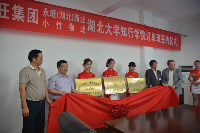 签字仪式上,钟春敏、椎名孝夫、生田德明代表三方签订了订单班合作协议。吴志文、王文凯、椎名孝夫、古田德明共同为“湖北大学知行学院实习实训基地”和“永旺(湖北)商业有限公司人力资源培训基地”揭牌。签字及揭牌仪式后,双方代表还就校企合作办学的具体事宜开展了深入广泛的交流。(文/通讯员石畅学通社记者裴易华刘建智图/马超)