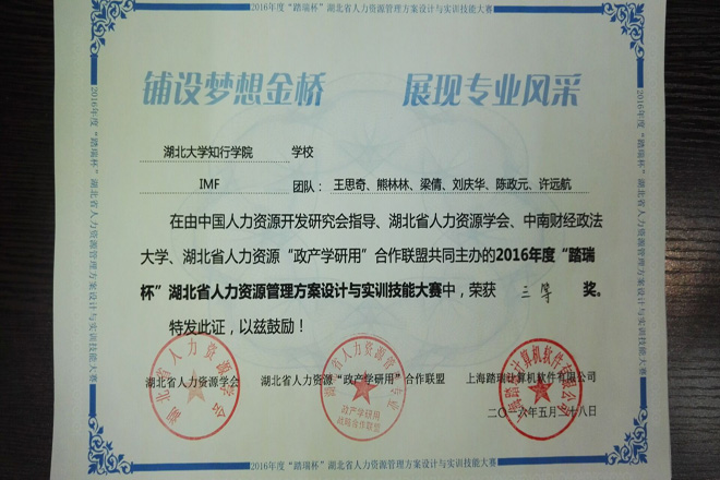 本网讯近日,2016年“踏瑞杯”湖北省人力资源实训大赛在中南财经政法大学圆满落幕,我院经济与管理系13级人力资源管理专业学生团队荣获大赛三等奖。