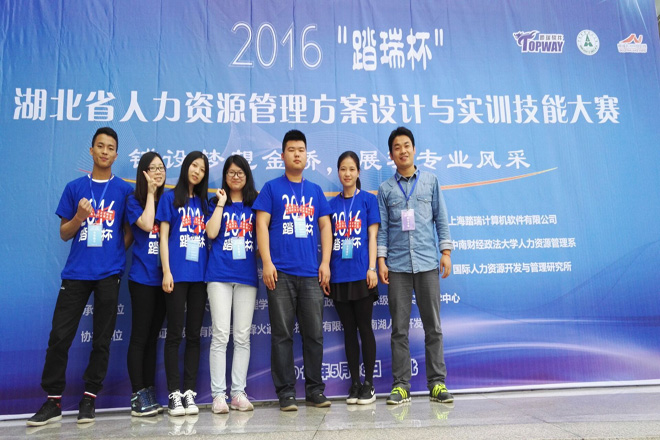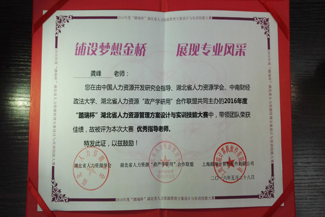 2016年“踏瑞杯”湖北省人力资源实训大赛由中国人力资源开发研究会指导,湖北省人力资源学会、湖北省人力资源“政产学研用”合作联盟及中南财经政法大学主办,比赛吸引了武汉大学、华中科技大学等众多重点高校学生参赛。经过前期预赛,包括我院在内的全省27支队伍进入决赛展开激烈角逐。决赛中,我院经管系参赛队通过全真的角色模拟,从公司的战略出发,亲身体验公司设立、岗位设置、求职与招聘、劳动合同签订、绩效考核与薪酬管理等人力资源管理流程,在比赛中展现了扎实的专业基础和良好的团队协作精神,得到了评委的充分肯定,最后荣获大赛三等奖。经管系教师龚峰获“优秀指导老师”荣誉称号。