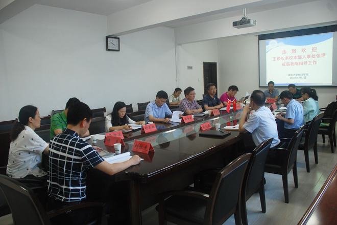 本网讯 6月12日下午,湖北大学副校长王世敏率人事处处长刘晓波、副处长卢轶婷一行三人莅临我院检查指导工作,主持召开专题座谈会,就如何完善师资队伍结构、加强师资队伍建设进行专项调研,学院党政班子成员和相关职能部门负责人参加调研座谈会。