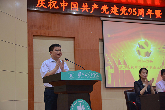 会上,党委书记吴志文代表学院党委讲话。他首先向全院共产党员和师生员工致以诚挚的问候,向受到表彰的先进集体和个人表示热烈的祝贺。吴志文回顾了中国共产党走过的95年光辉历程,从九个方面对学院过去一年来所取得的可喜成绩作了回顾和总结。他指出,过去一年来,学院党委积极适应高等教育发展的新形势、新任务和新要求,紧紧围绕“建成规模结构合理、优势特色鲜明、创新创业能力突出、对区域经济社会发展有重大贡献的应用技术型高校”办学目标,团结带领全院师生,抢抓机遇,锐意改革,不断超越,全面提升党建与思想政治教育工作水平,较好地履行了党对高校领导的主体责任,坚持了社会主义办学方向、促进了学院科学发展、确保了校园和谐稳定,转型发展各项事业取得新进展、立德树人工作取得新成绩、学院整体办学水平、综合实力和社会声誉再上新台阶,开启了“十三五”学院建设与发展的新篇章。
