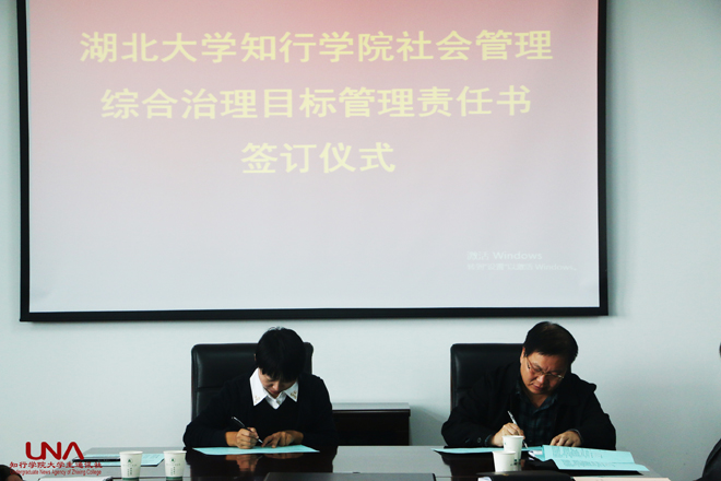 本网讯11月5日上午,学院社会管理综合治理目标管理责任书签订仪式在知远楼601会议室举行。学院党委书记吴志文、党委副书记高志宏、副院长钟春敏、王文凯出席会议,各系部、各职能部门及直属单位主要负责人参加会议。会议由副院长王文凯主持。