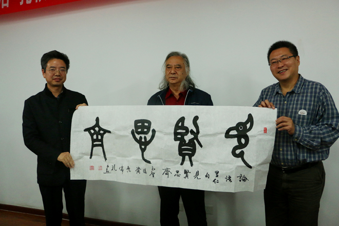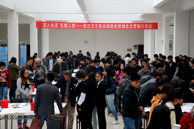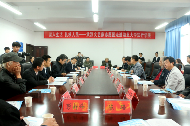 武汉市文联和我院高度重视此次活动的开展。武汉市文联党组书记吕兵、副主席王开学亲临现场,参加文艺家志愿团与我院部分师生的座谈会和示范笔画活动。座谈会上,吕兵书记指出,人民需要艺术,艺术更需要人民,送文艺进校园是艺术家主动承担社会责任的方式之一,本次活动同时也为众多艺术家的创作提供了一次走近当代大学生群体的良好契机,希望文联和知行学院今后“常来常往”,进一步整合双方资源,探索在知行学院建立“文艺基地”,促进双方的共同发展。学院院长彭德忠热情接待了武汉市文联领导和武汉艺术家志愿团的艺术家们,真诚感谢他们对知行学院的关心与厚爱并简要介绍了学院的基本情况。彭徳忠强调,校园文化建设工作对我院转型发展将会起到积极的促进作用,它是展示学院教育理念、彰显学院办学特色、积淀学院办学文化的重要平台,也是师生精神风貌、价值取向的综合体现,热切期待艺术家们把知行学院当作体验生活、创新艺术和培养传人的基地,长期驻扎。