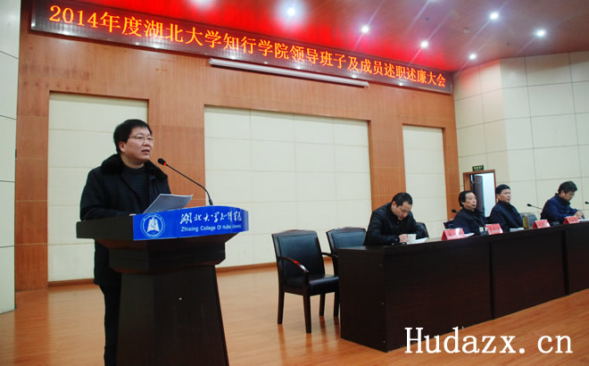 本网讯(通讯员 文刀)2015年1月24日,学院领导班子及成员述职述廉大会在学术报告厅201室召开。院党委书记吴志文代表学院党政领导班子作了述职述廉报告,院领导班子成员分别作了个人述职述廉报告。湖北大学校领导刘星海,校党委组织部副部长焦新曦、干部科科长宋韧出席了大会,学院全体教职工参加了会议。党委书记吴志文代表学院党政领导班子述职述廉时指出,2014年是我院极不平凡的一年,学院新的领导班子上任后,在校党委的领导、关心和支持下,团结和带领全院干部教师,抓改革、保稳定、谋发展,顺利完成了学院全年的工作目标和任务,各项工作取得了可喜的成绩。他从八个方面全面总结了我院2014年度的工作情况:一是招生和就业工作取得了较好成绩,确保了学院办学规模的基本稳定;二是加强学科专业建设,提高教育教学质量,提升服务地方经济社会发展的能力和水平;三是稳步推进学院的应用转型发展,力争把学院建设成为水平较高、特色鲜明的应用型本科院校,实现与湖北大学本部的错位发展和优势互补;四是启动学院综合管理体制改革,为学院应用转型发展注入新的活力;五是后勤保障工作卓有成效,提升了服务理念和执行效率,为万名师生的学习、工作和生活提供了安全舒心的环境;六是关注改善民生工作,不断加大制度建设和分配制度改革力度,改善教职工生活条件和福利待遇,大力促进校园和谐;七是创新体制机制,不断创新大学生思想政治工作的方法和途径,提高学生管理工作水平;八是加强党建与思想政治工作,以实际行动为武汉市创建全国文明城市做贡献。吴书记强调指出,院党政领导班子成员严格按照上级组织要求,自觉履行“一岗双责”,落实党风廉政建设责任制,从各方面严格要求自己,学院全年未发生任何违反党风廉政建设情况,全院师生员工思想稳定,精神状态良好。