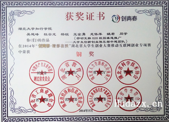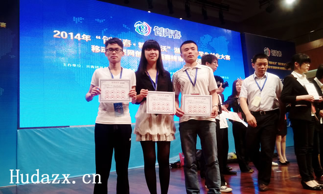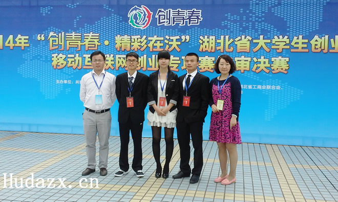 本网讯 (通讯员 刘锐)5月15日,为期两天的2014年“创青春.精彩在沃”湖北省大学生创业大赛移动互联网创业专项赛在宜昌三峡大学圆满落幕,我院经管系组建的团队作品《移动互联O2O校园渠道推广》喜获铜奖。经管系副书记刘锐、工管教研室主任陈文锦老师带队前往参加比赛。
