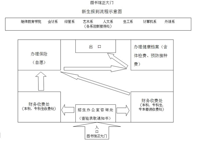 新生凭验章后的录取通知书和财务收费凭据到各系新生接待处报到(图书馆门口)。