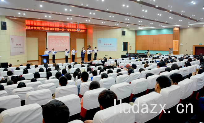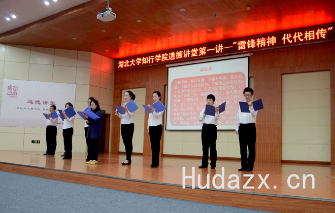 全场400余名师生合唱《学习雷锋好榜样》拉开了本次道德讲堂的序幕。通过大屏幕,师生共同观看雷锋事迹的视频。“人的生命是有限的,为人民服务是无限的,我要将有限的生命投入到无限的为人民服务中去。”我院学子用实际行动践行雷锋精神,通过爱心打扫公交、地球一小时节能周、“关爱天使”辅读学习活动等活动发扬并传播雷锋精神。