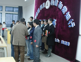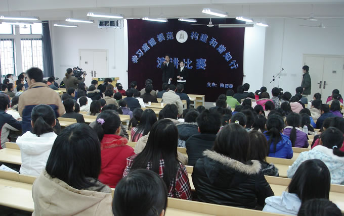 此次比赛每系各推出2名代表,共12名选手参加。4时许,比赛正式开始。选手们一一登台演讲。演讲台上,他们镇定、淡然,向观众们一一讲述着道德模范们的先进的事迹:文花枝绝境中让出生的希望、丛飞患癌症依旧捐款等等。话语中,纷纷透露出对模范们的崇敬之情。在整个演讲的过程中,观众们都仔细的聆听,并不时的作着笔记。情到深处,观众们被深深打动,掌声也是此起彼伏。