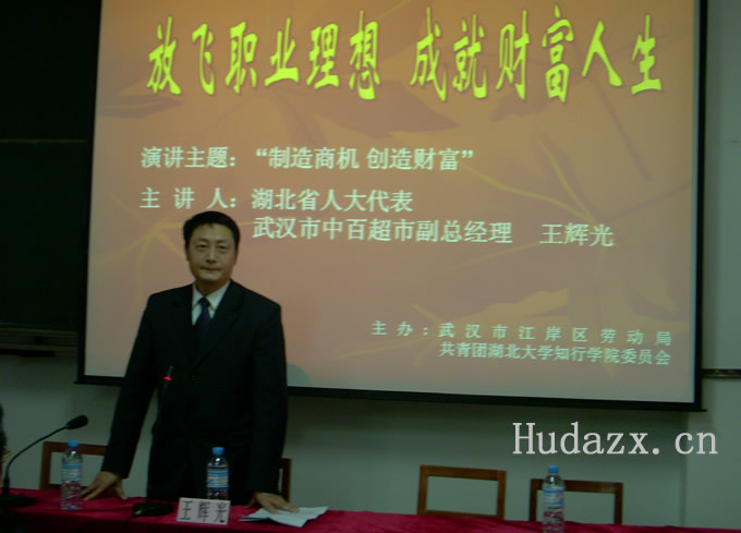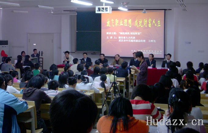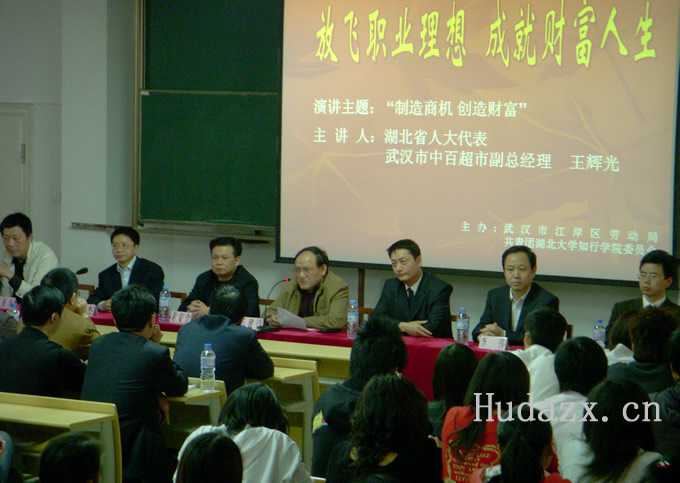 4月24日下午,江岸区首届全民创业意识活动系列讲座在我院4栋307多媒体教室隆重举行。湖北省人大代表、武汉市中百超市副总经理王辉光先生为全院师生奉上了一堂精彩的“创业课”。武汉市及江岸区劳动局、谌家矶街、学院领导出席了此次讲座。