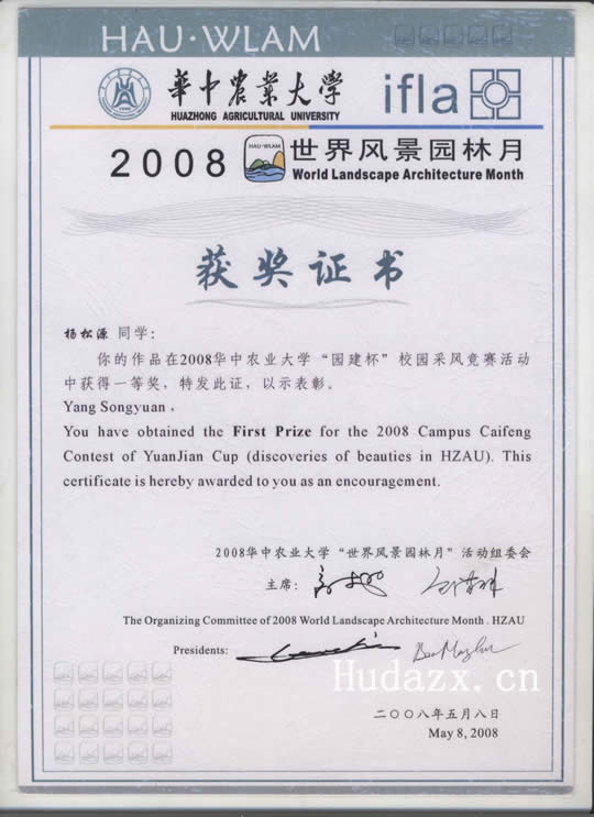 近日,记者从华中农业大学2008世界风景园林月活动组委会获悉,我院艺术系学生在此次“园建杯”校园采风竞赛活动中取得优异成绩,杨松源获得一等奖,王少坤获得二等奖,张磊、陈囡囡获得三等奖,吴晓霞、马莹、吕青、喻宇、张轩、曹宇堃、石昇艳等七名学生获得鼓励奖。(院学通社李庆)